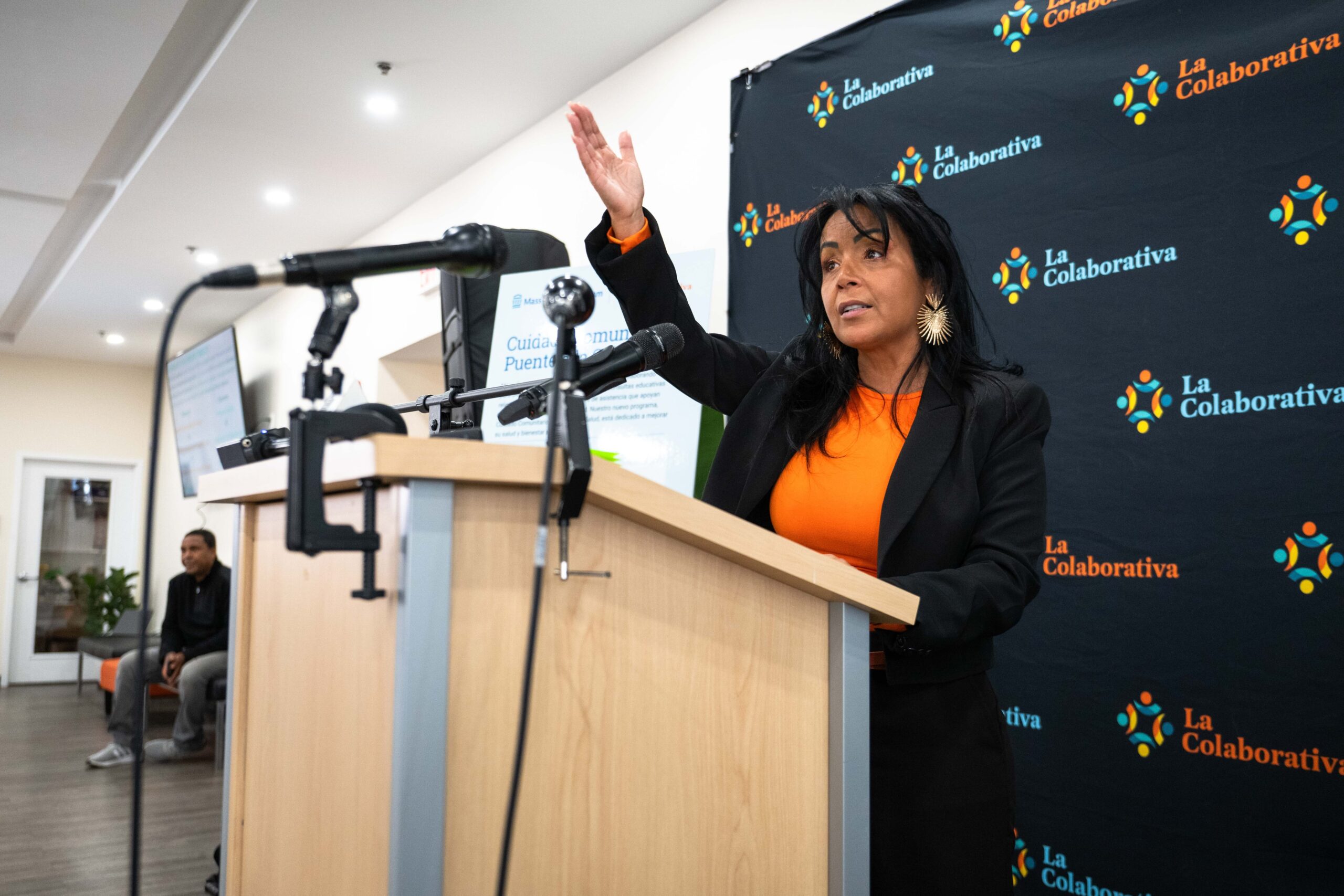 Gladys Vega, CEO and president of La Colaborativa, speaks during a press conference at La Colaborativa’s Survival Center in Chelsea, on Oct. 16, 2024, to announce La Colaborativa Community Care: Bridge to Health/Puente a La Salud, which will offer essential health care services. (Photo by Andrew Burke-Stevenson/The Boston Globe via Getty Images)