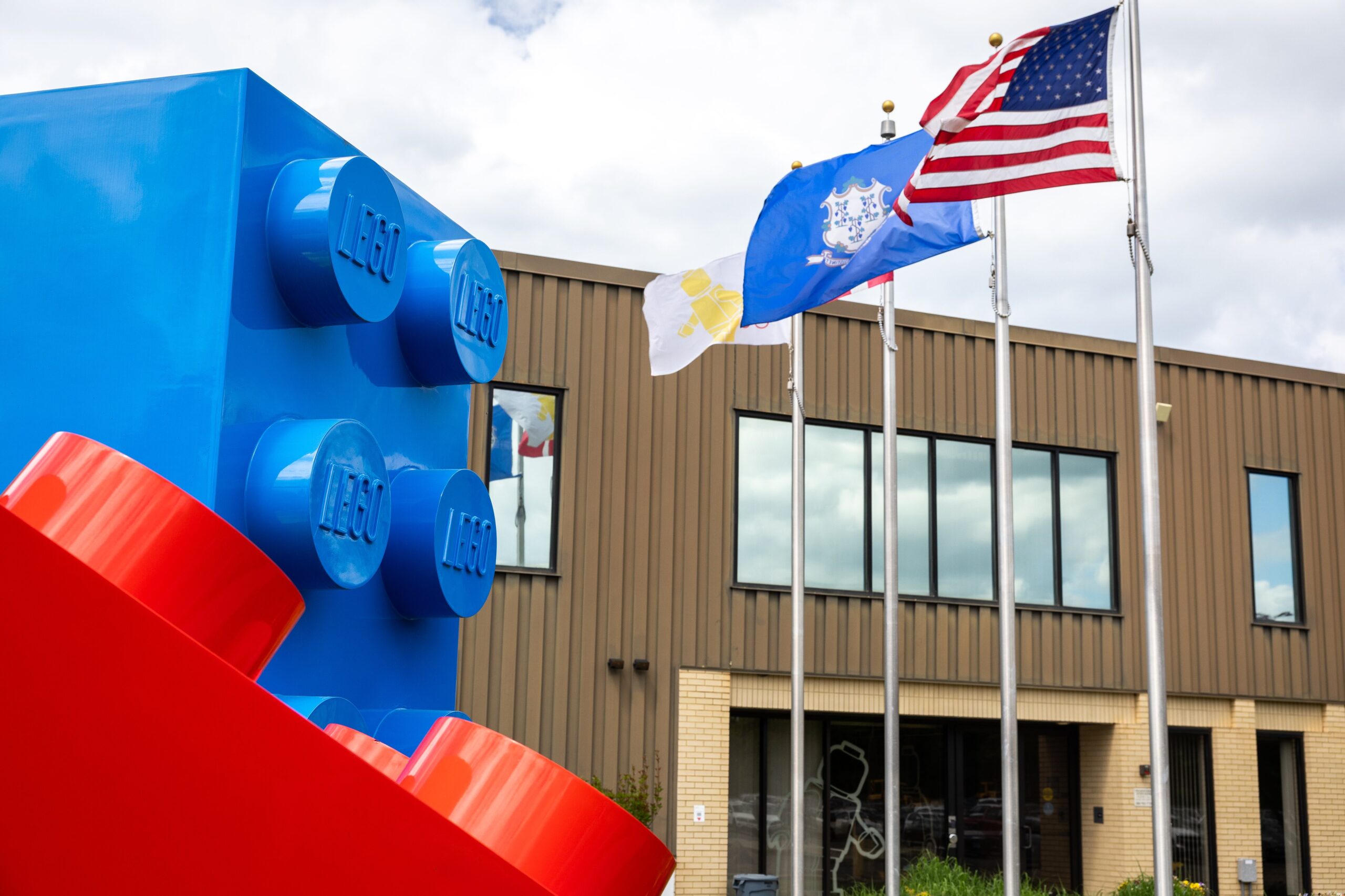 A stack of large LEGO bricks sits outside the former LEGO Group Headquarters in Enfield, Conn., on May 14, 2025. Since relocating to Boston earlier this year, the Danish company has not erected such a display in front of its building. (Douglas Hook/The Republican)