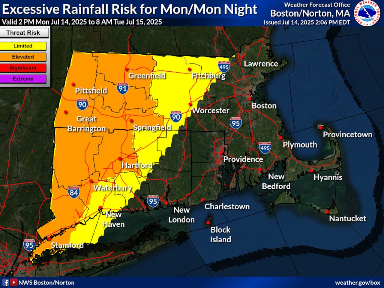 Additionally, a flash flood watch continues to be in effect for western and eastern Franklin, western and eastern Hampshire and western and eastern Hampden counties. This watch — in effect until later Monday night — warns that excessive runoff could cause rivers, creeks and streams to flood, along with causing waters to rise in urban areas.