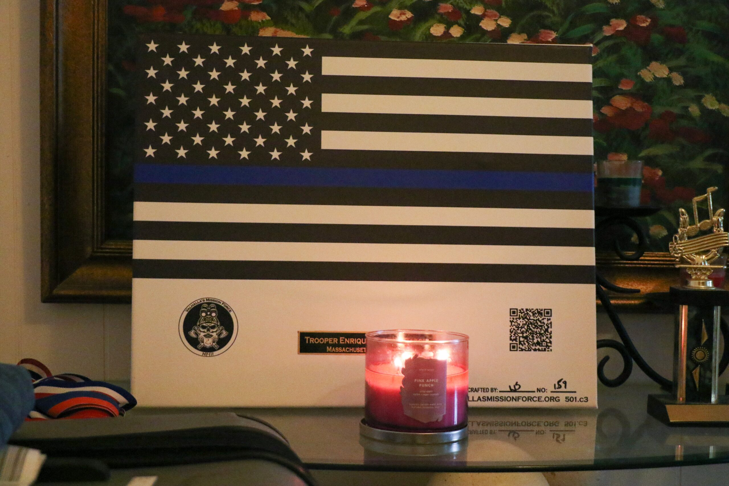 An American flag featuring a thin blue line, set against an unmarked canvas bearing the name of Trooper Enrique Delgado-García in black and gold lettering. (Gustavo Atencio Flores/MassLive)