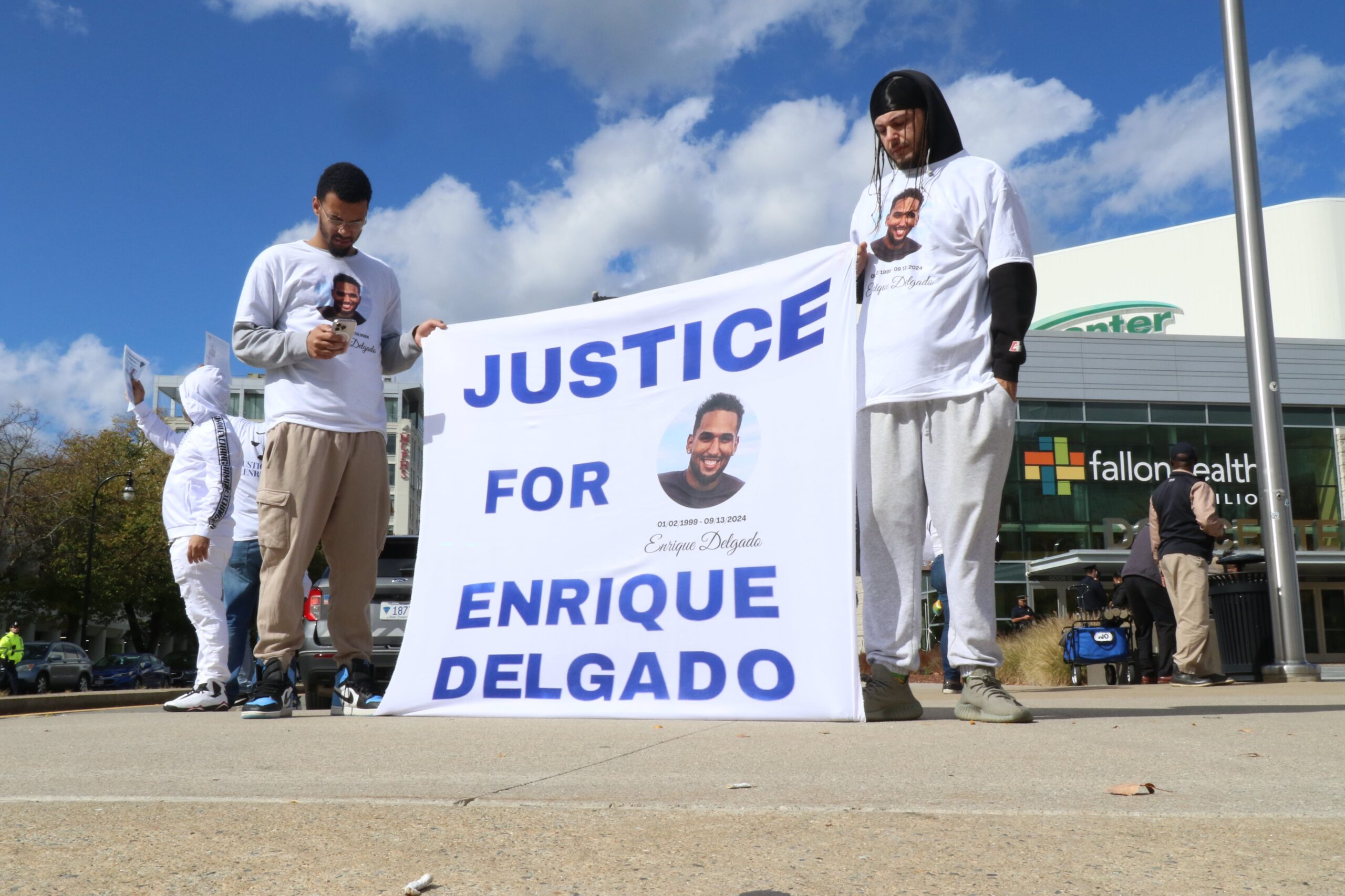 Protesters gathered outside the DCU in Worcester during graduation ceremonies for the 90th recruitment class. The protesters gathered in support of Enrique Delgado-García, a Massachusetts State Police trooper, who died on Sept. 13, 2024, from injuries suffered during a training incident at the police academy. (Luis Fieldman/MassLive)