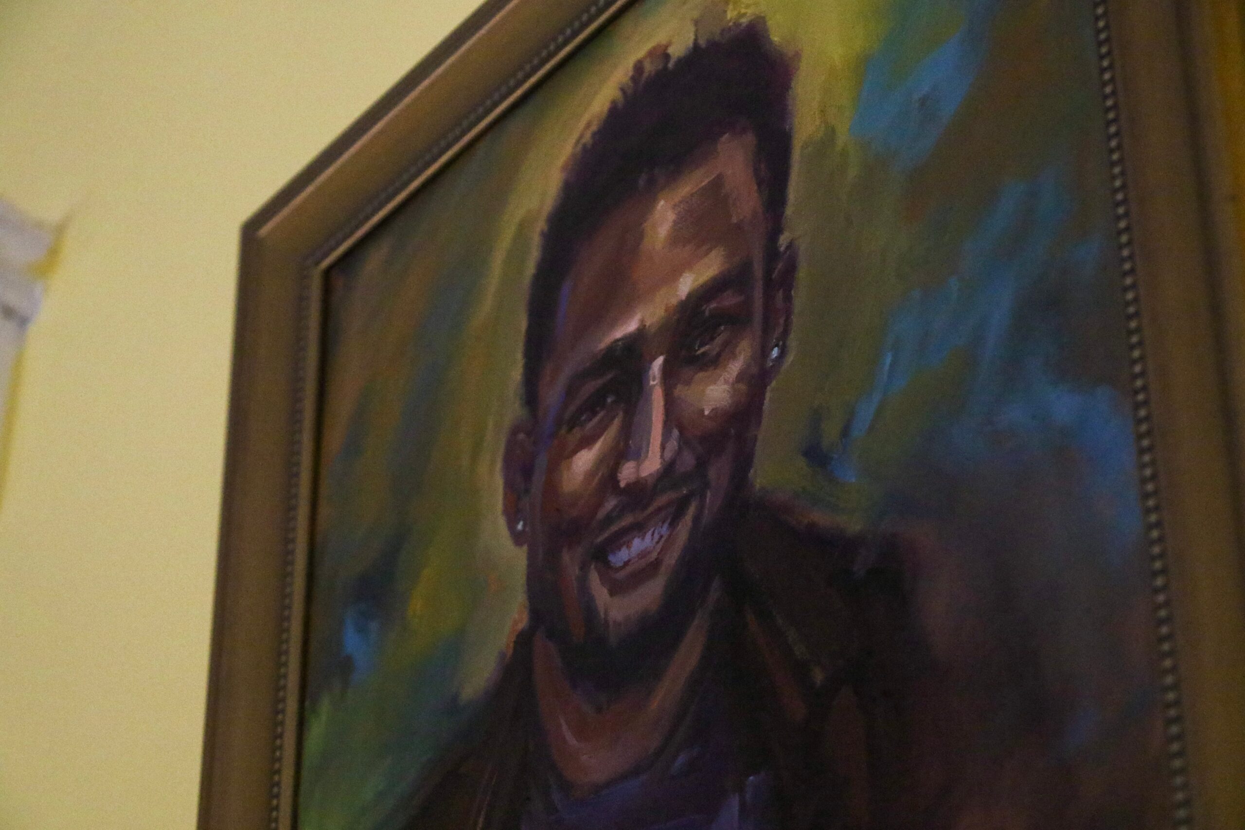 A painted portrait of Enrique Delgado-García hangs in the living room of the family’s home in Worcester. (Gustavo Atencio Flores/MassLive)