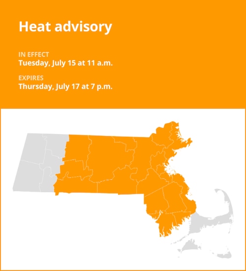 A heat advisory was issued by the National Weather Service on Tuesday at 2:14 a.m. valid from 11 a.m. until Thursday 7 p.m. for Northern Worcester and Southern Worcester as well as Franklin, Middlesex, Essex, Hampshire, Hampden, Norfolk, Suffolk, Bristol and Plymouth counties.