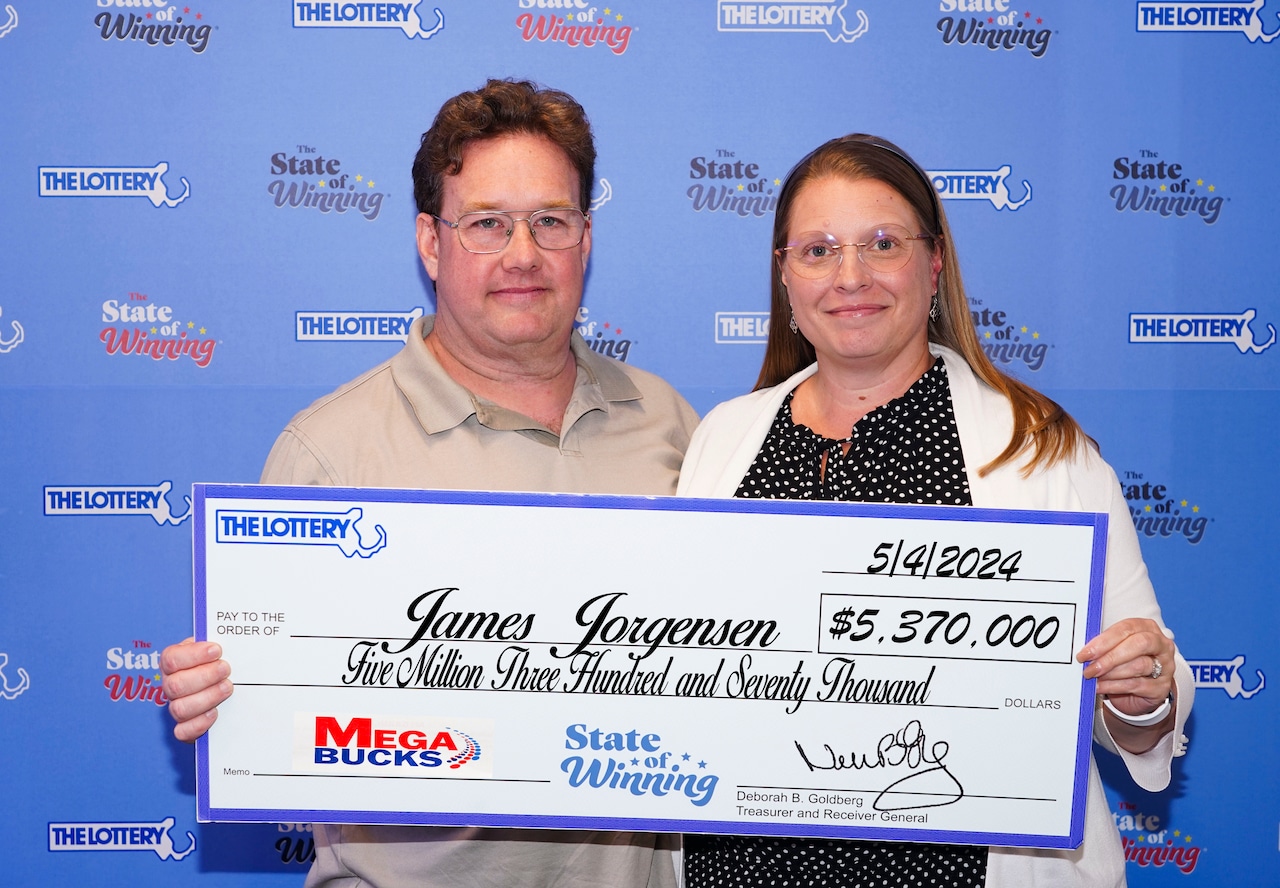 James Jorgensen was joined by his partner, Jennifer Jorgensen, when he claimed his winning “Megabucks” ticket on May 6. He chose to receive his prize in a one-time payment of just over $3.6 million before taxes.