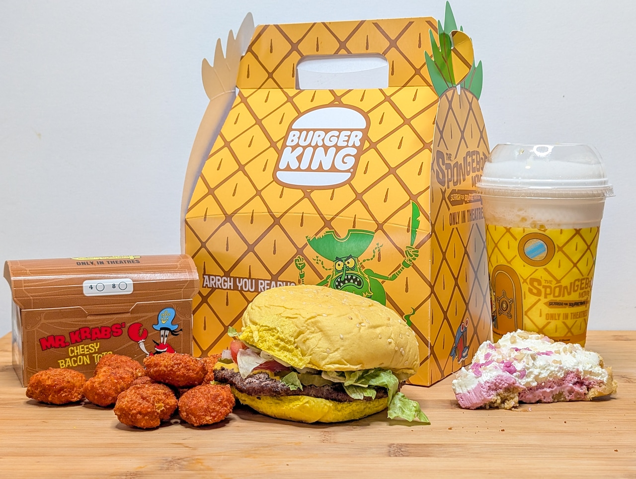 The Cheesy Bacon Tots are awesome. The Star-berry Shortcake Pie is pretty good. The Krabby Whopper is just a normal Whopper with food coloring.