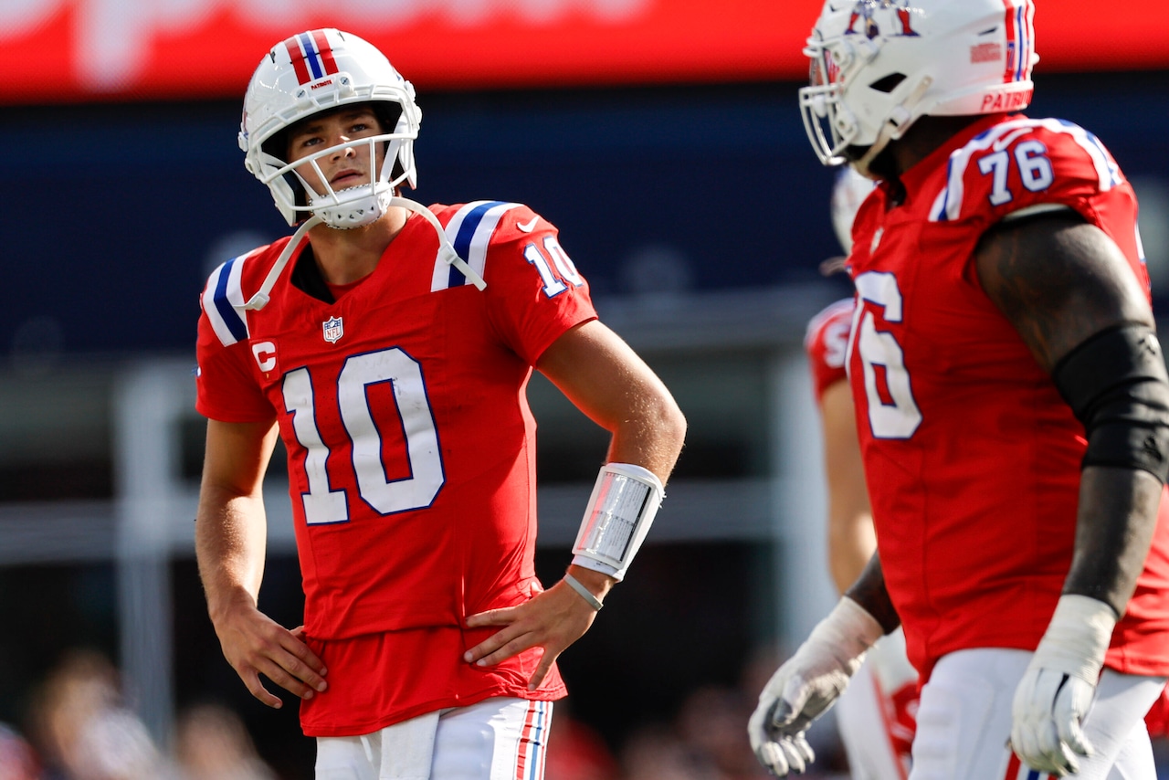 Then there’s quarterback Drake Maye. On the plus side, he was 28-for 37, 268 yards and 2 TDs. He made plays with his legs. He made plays to make you believe everything will eventually be fine.