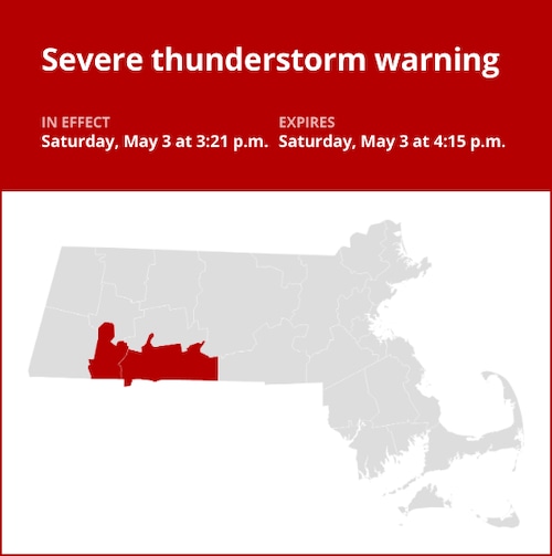 The National Weather Service released a severe thunderstorm warning at 3:21 p.m. on Saturday in effect until 4:15 p.m. for Hampden County.