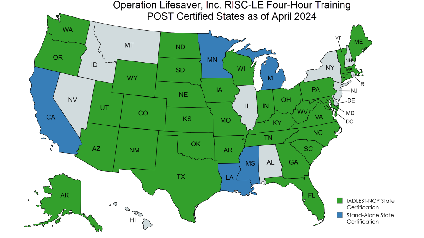WASHINGTON — Operation Lifesaver, Inc. (OLI), the leading rail safety education nonprofit, announced today that its four-hour Railroad Investigation and Safety Course for Law Enforcement (RISC-LE) has received the International Association of Directors of Law Enforcement Standards and Training (IADLEST) National Certification Program (NCP) Seal of Excellence. IADLEST-NCP Certified programs are recognized by 35 states and the District of Columbia for Peace Officer Standards and Training (POST). Five additional states previously approved stand-alone POST certifications for the OLI training, for a total of 40 POST certification approvals for RISC-LE.