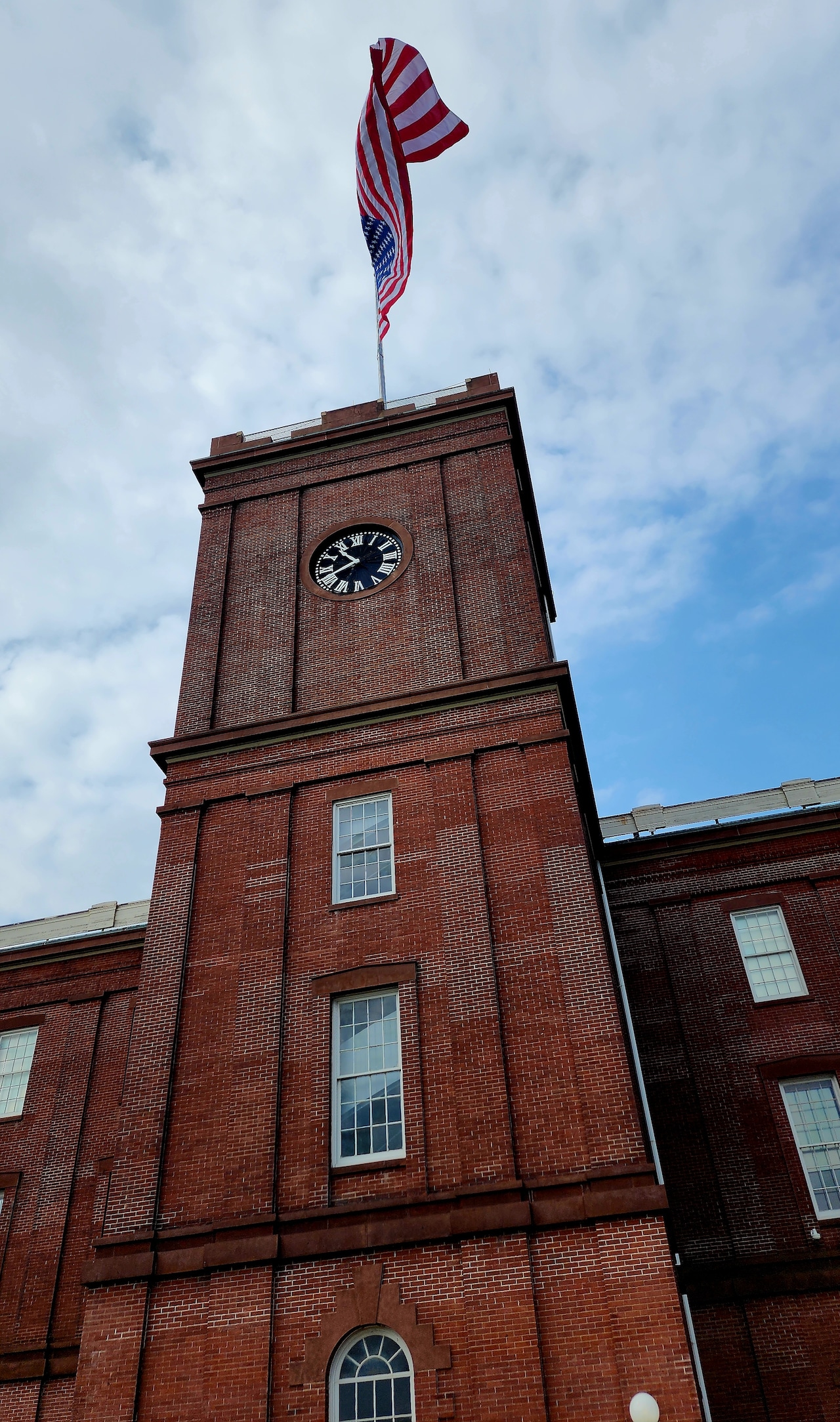 large United States flag on top of the clock tower.