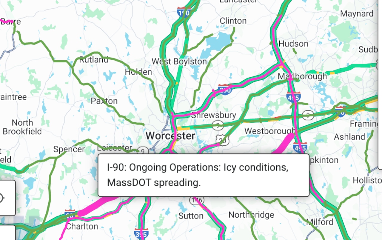 MassDOT’s 511 traffic map shows ice on the Massachusetts Turnpike between US 20 (Blandford) and exit 54 near Ludlow. Ice is possible again between Route-31 (Charlton) and U.S. 20 (Auburn).