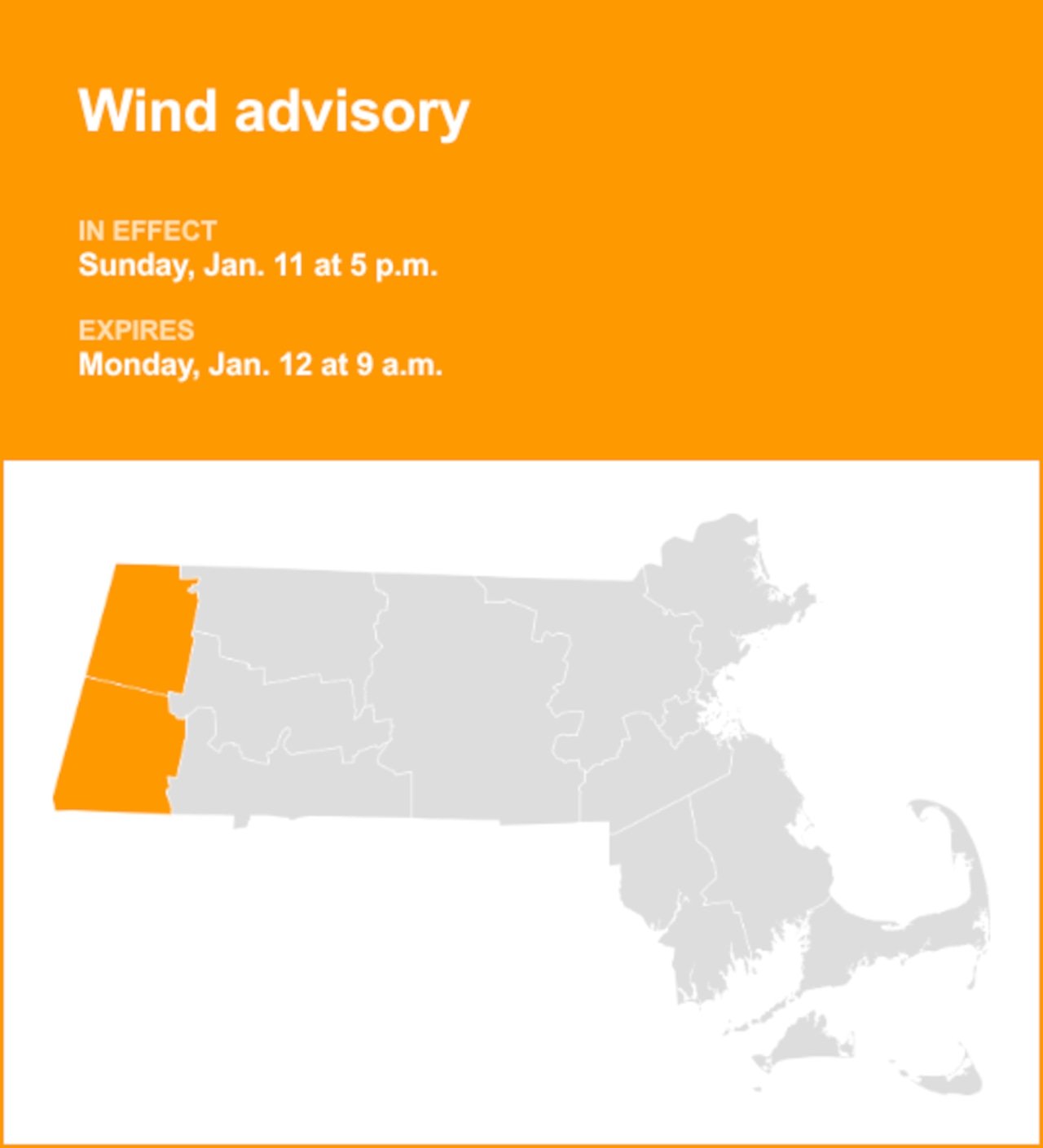 On Sunday at 12:31 a.m. a wind advisory was released by the National Weather Service valid from 5 p.m. until Monday 9 a.m. for Berkshire County.