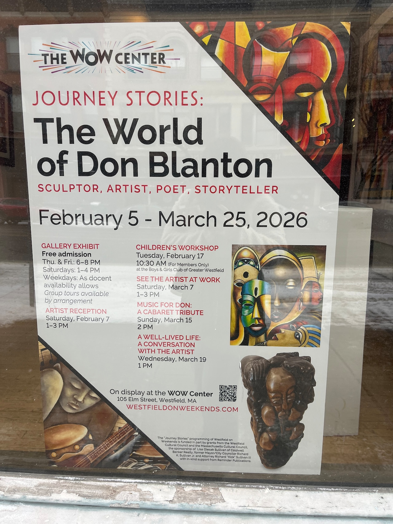 Through sculpture, storytelling and live demonstration, “Journey Stories” offers visitors a chance to reflect on history, identity and shared humanity — themes that both the artist and the WOW Center say remain as urgent as ever. The WOW Creative Arts Center can be found at 105 Elm St., and the building’s hours vary.